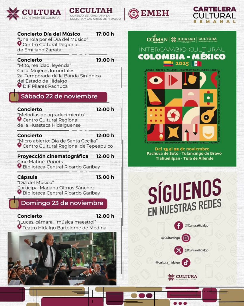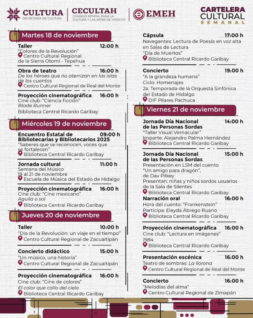 Publicado el 18 de noviembre de 202524 de noviembre de 2025 por culturahidalgo Cartelera cultural del 18 al 23 de noviembre 2025