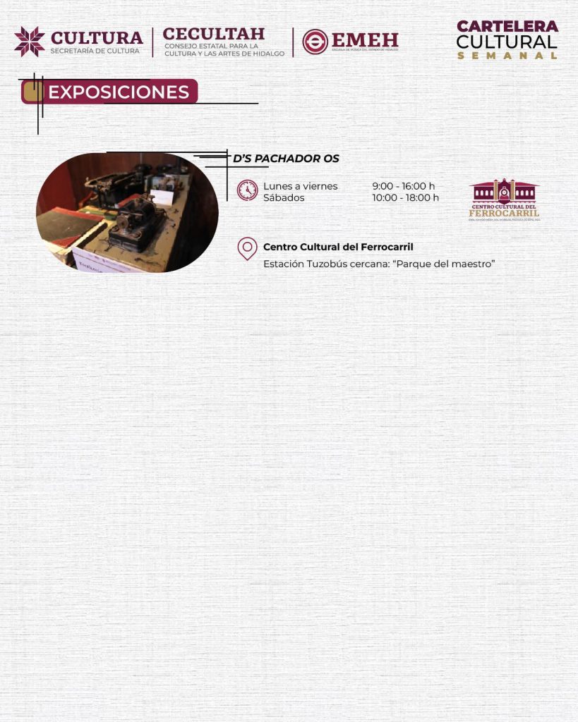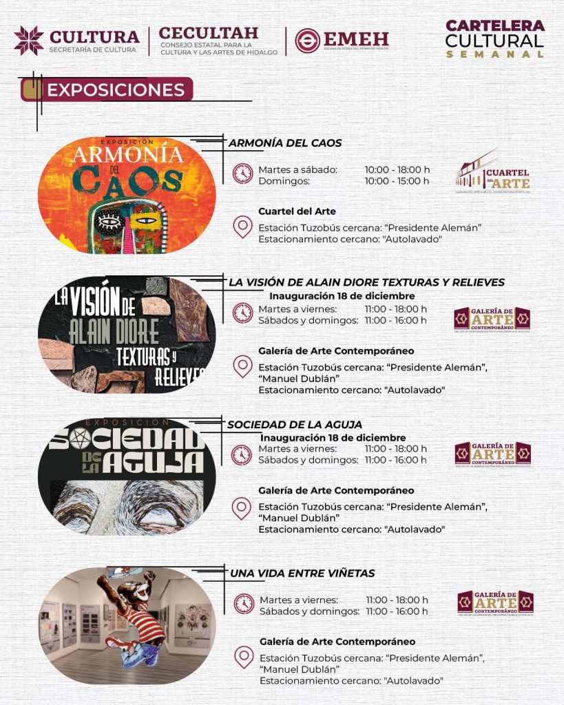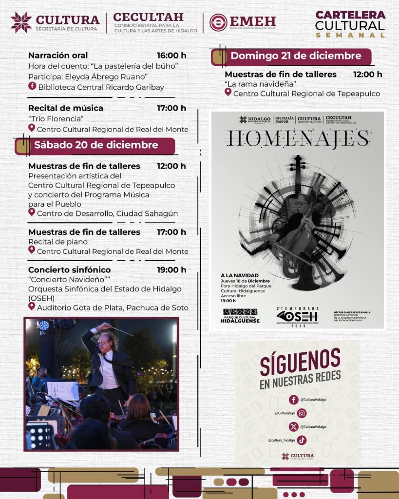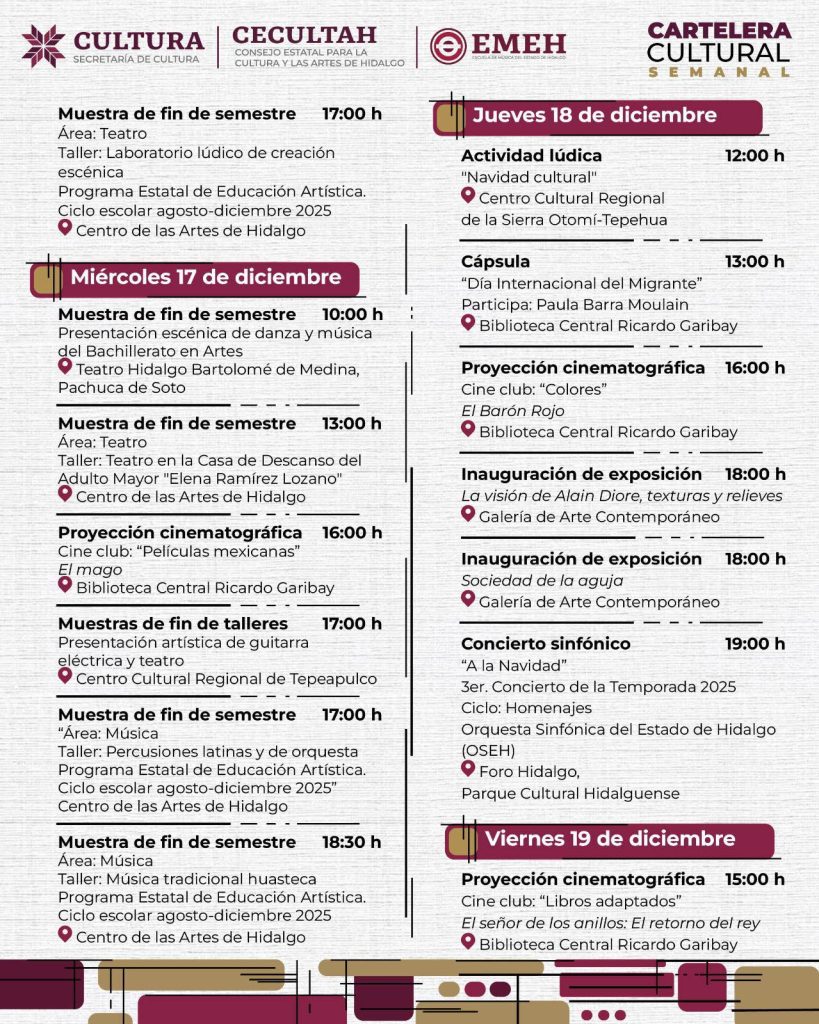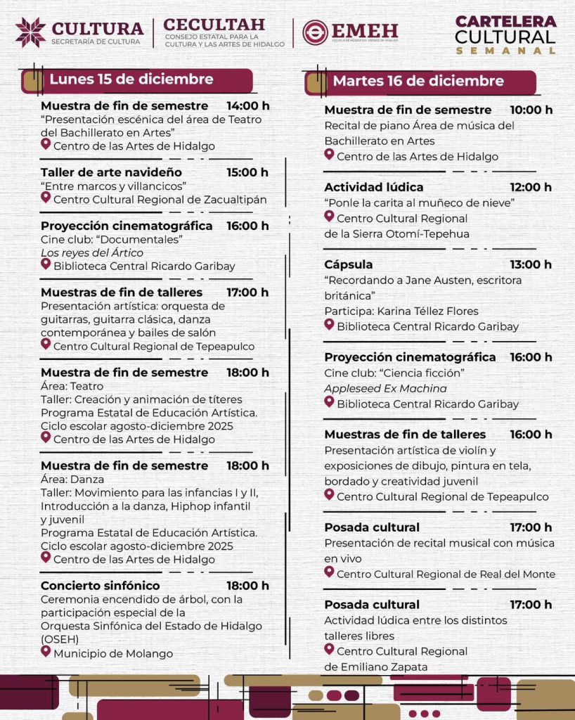 – Los horarios de las presentaciones y talleres están disponibles en la cartelera cultural de la página web oficial de la Secretaría de Cultura (https://culturahidalgo.gob.mx/), así como en las redes sociales de la misma