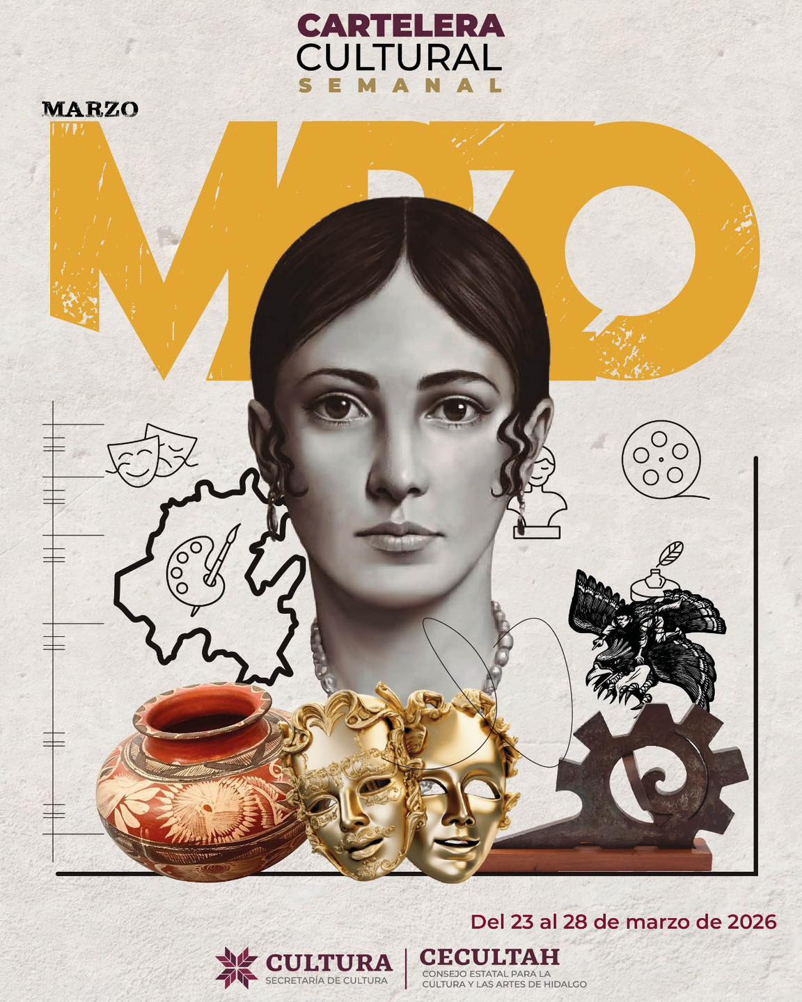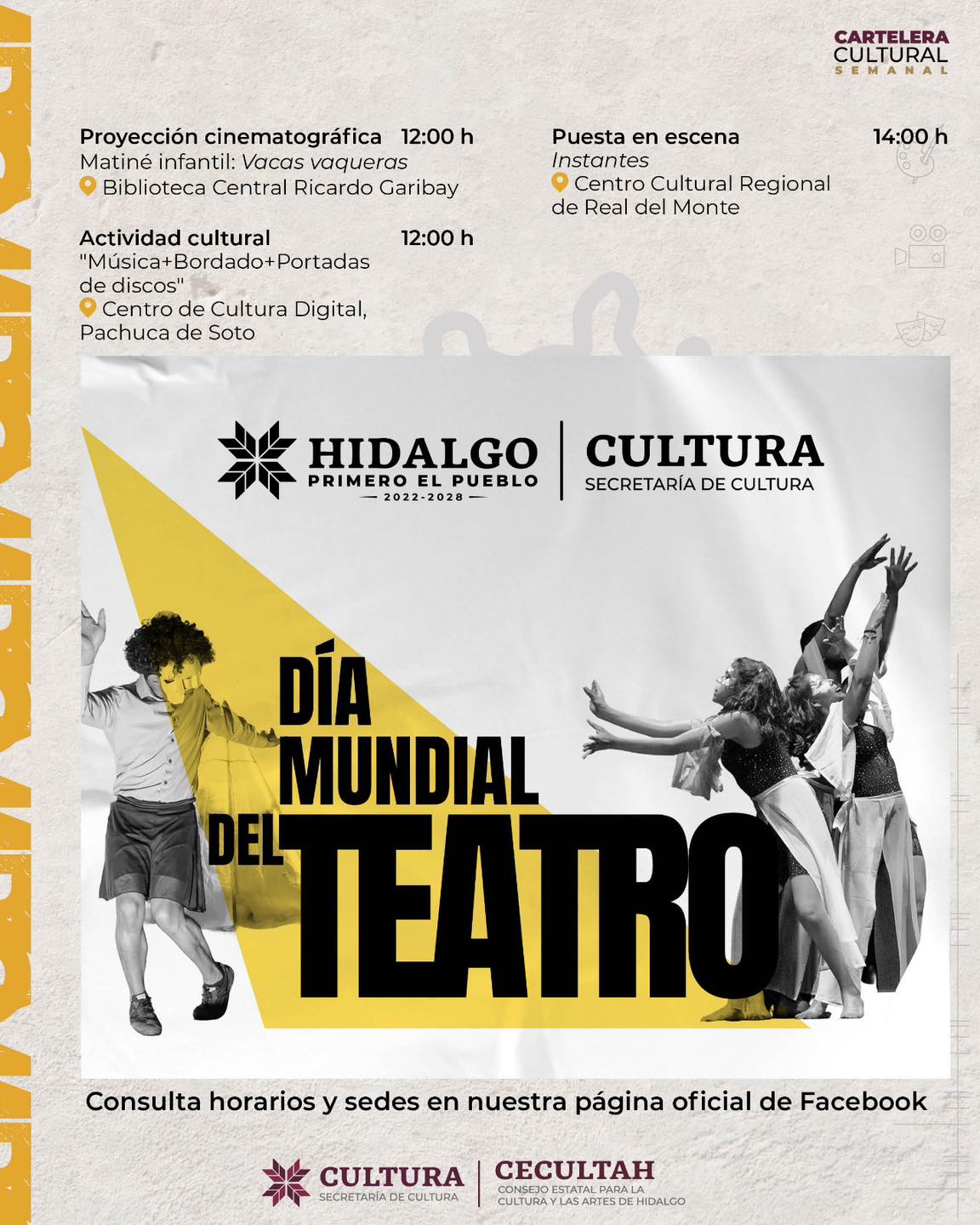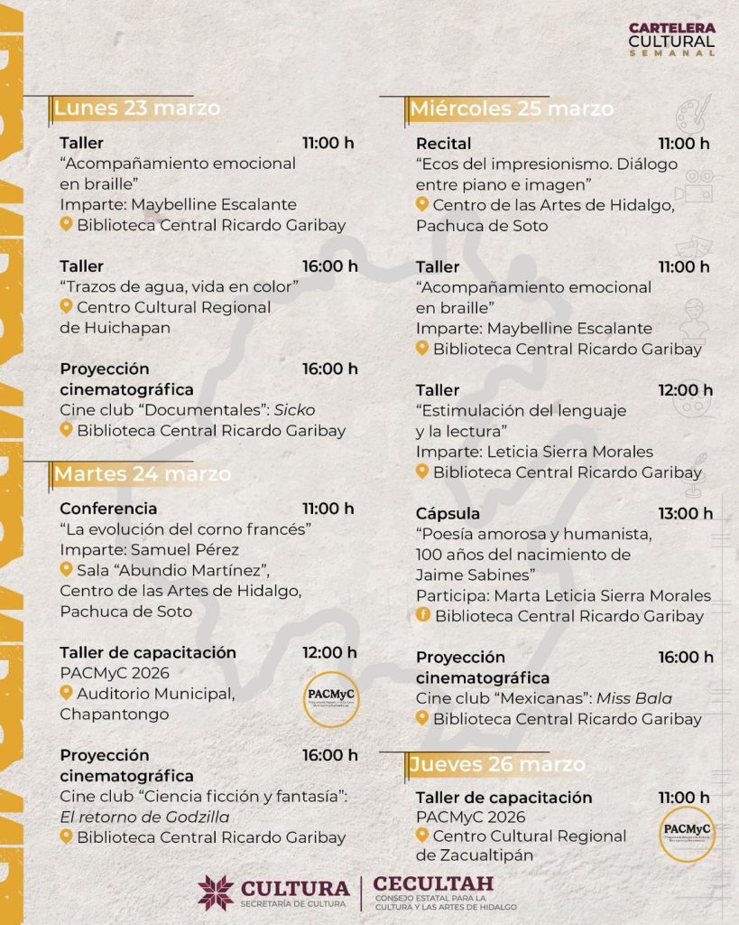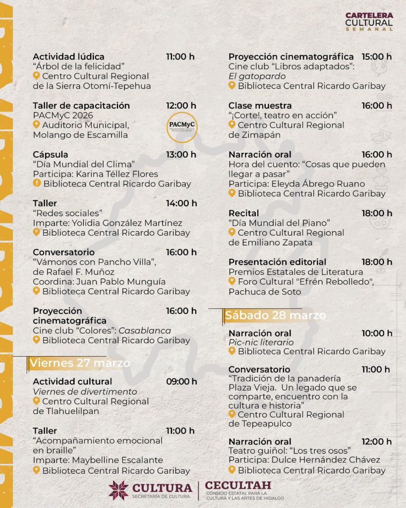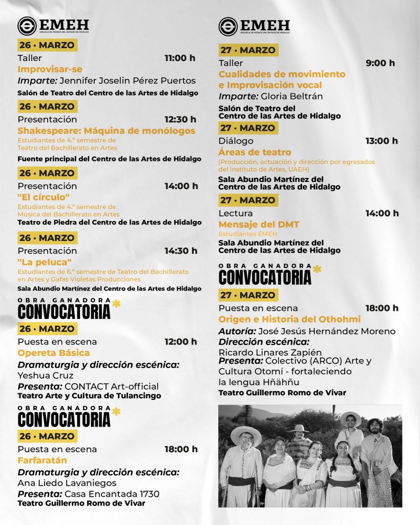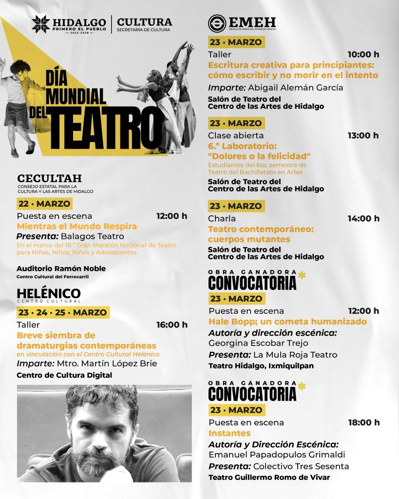 La Secretaría de Cultura del Estado de Hidalgo, en coordinación con la Escuela de Música del Estado de Hidalgo (EMEH) y el Consejo Estatal para la Cultura y las Artes de Hidalgo (CECULTAH), presenta una programación artística con motivo del Día Mundial del Teatro, que se llevará a cabo del 22 al 27 de marzo en diversos espacios culturales de la entidad.