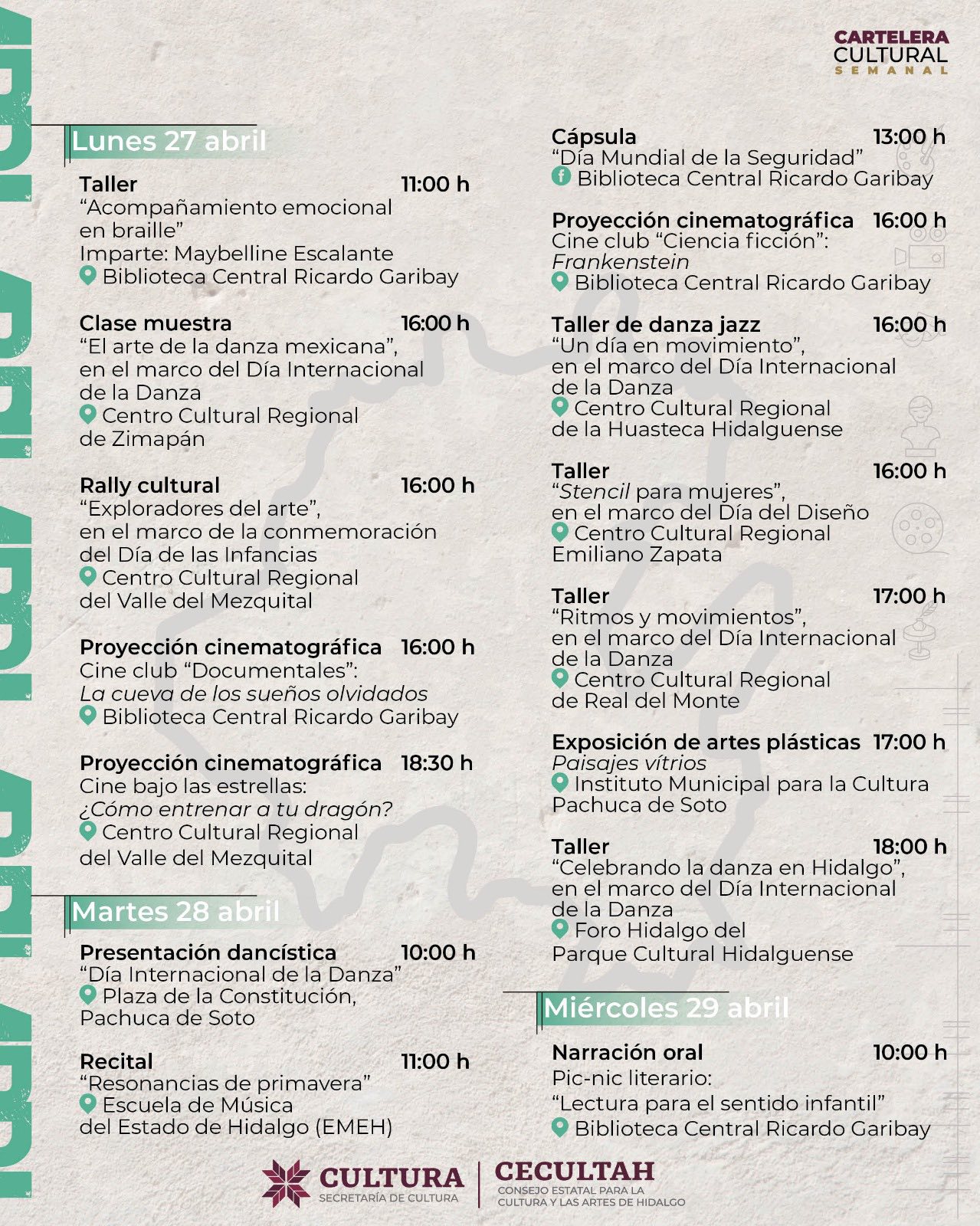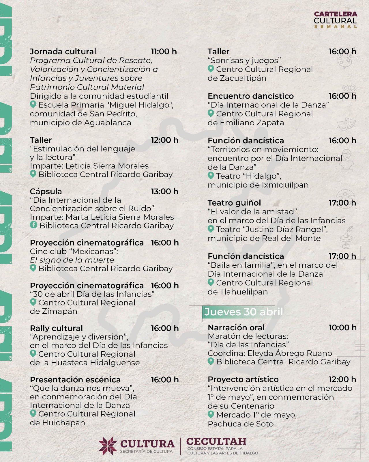 Durante la jornada se contó con la presencia de la titular de cultura, Neyda Naranjo Baltazar; Edda Vite Ramos, presidenta del Patronato del Sistema DIF Hidalgo; y Daniel Fragoso Torres, subsecretario de Educación Media Superior y Superior, en representación de la Secretaría de Educación Pública estatal.