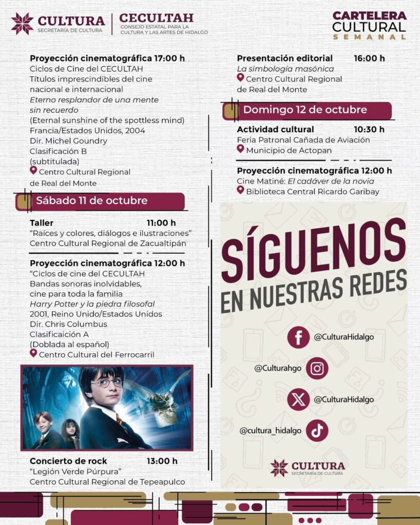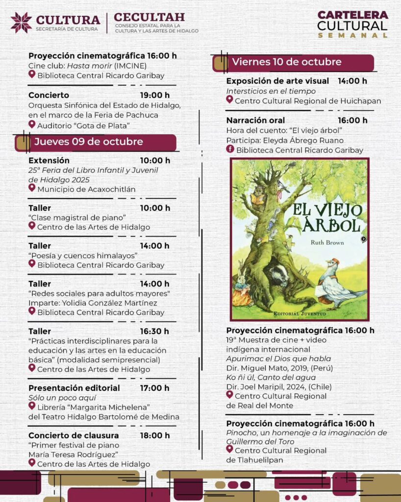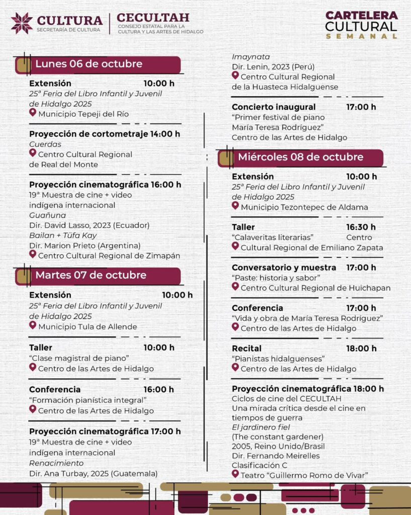 Publicado el 6 de octubre de 2025 por culturahidalgo Cartelera cultural del 06 al 12 de octubre 2025 Comparte esto: Haz clic para compartir en Facebook (Se abre en una ventana nueva) Facebook Haz clic para compartir en X (Se abre en una ventana nueva) X Relacionado Navegación de entradasAnterior: Anuncian “De Viva Voz”, Festival Hidalguense de Monólogos 2025