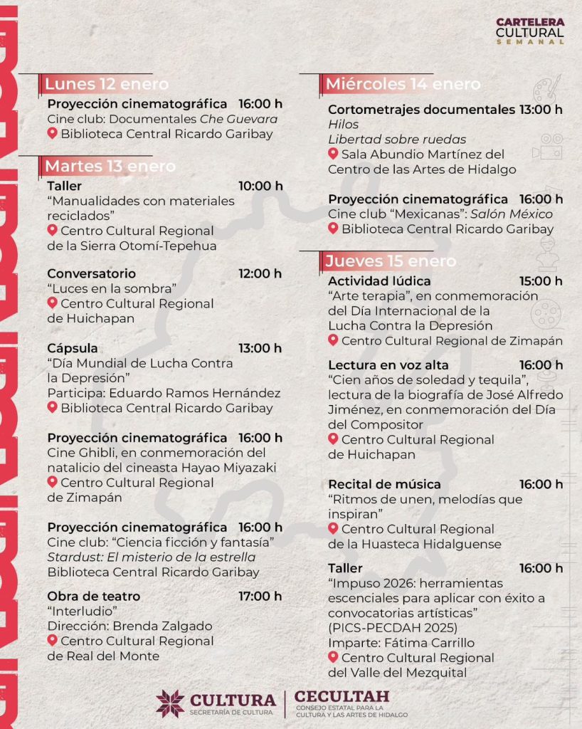 Publicado el 12 de enero de 202629 de enero de 2026 por culturahidalgo Cartelera cultural del 12 al 17 de enero 2026 Comparte esto: Haz clic para compartir en Facebook (Se abre en una ventana nueva) Facebook Haz clic para compartir en X (Se abre en una ventana nueva) X Relacionado Navegación de entradasAnterior: EMEH y UAM presentan muestra de cine etnográfico en el Centro de las Artes de HidalgoSiguiente: Hidalgo conmemora su 157 aniversario con jornada cultural