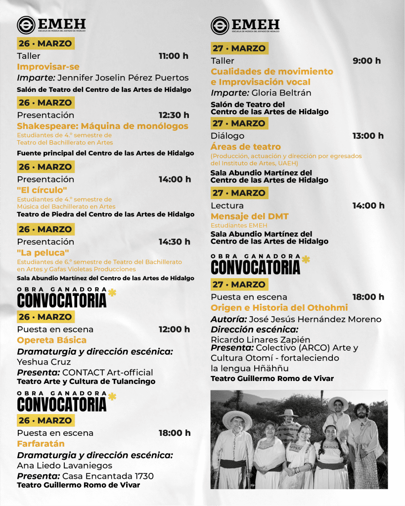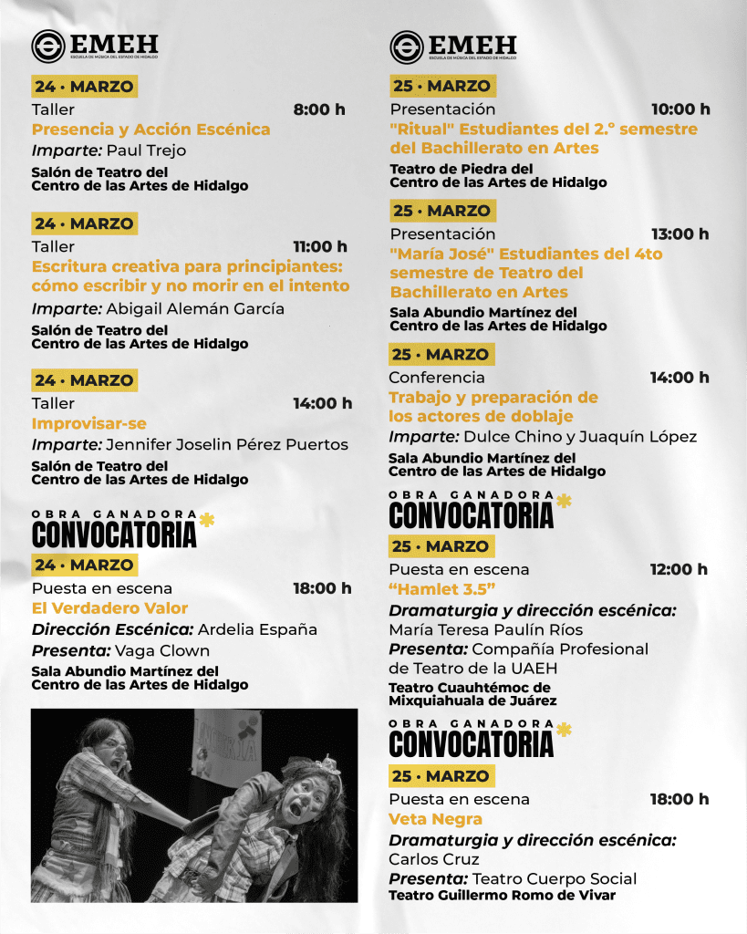 La Secretaría de Cultura del Estado de Hidalgo, en coordinación con la Escuela de Música del Estado de Hidalgo (EMEH) y el Consejo Estatal para la Cultura y las Artes de Hidalgo (CECULTAH), presenta una programación artística con motivo del Día Mundial del Teatro, que se llevará a cabo del 22 al 27 de marzo en diversos espacios culturales de la entidad.