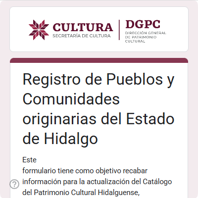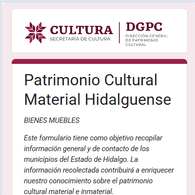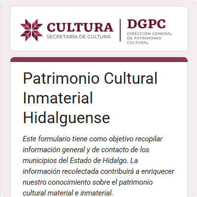 Con el objetivo de proteger y promover la riqueza cultural del estado de Hidalgo, hemos desarrollado tres formularios especializados que permiten documentar de manera ordenada y precisa el patrimonio cultural, tanto material como inmaterial. Estos formularios son parte esencial de un instrumento integral que servirá como herramienta de consulta y preservación a nivel municipal, estatal y nacional.